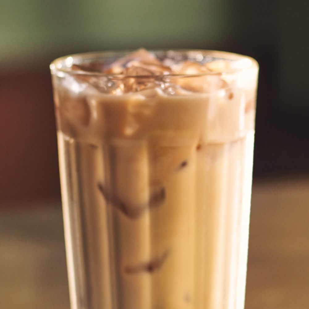 Coffee with rich mocha-flavored sauce blended with milk and ice. Topped with sweetened whipped cream.